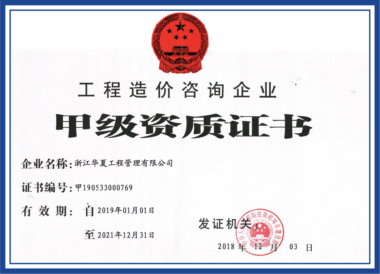 工程造價(jià)咨詢企業(yè)甲級(jí)資質(zhì)證書
